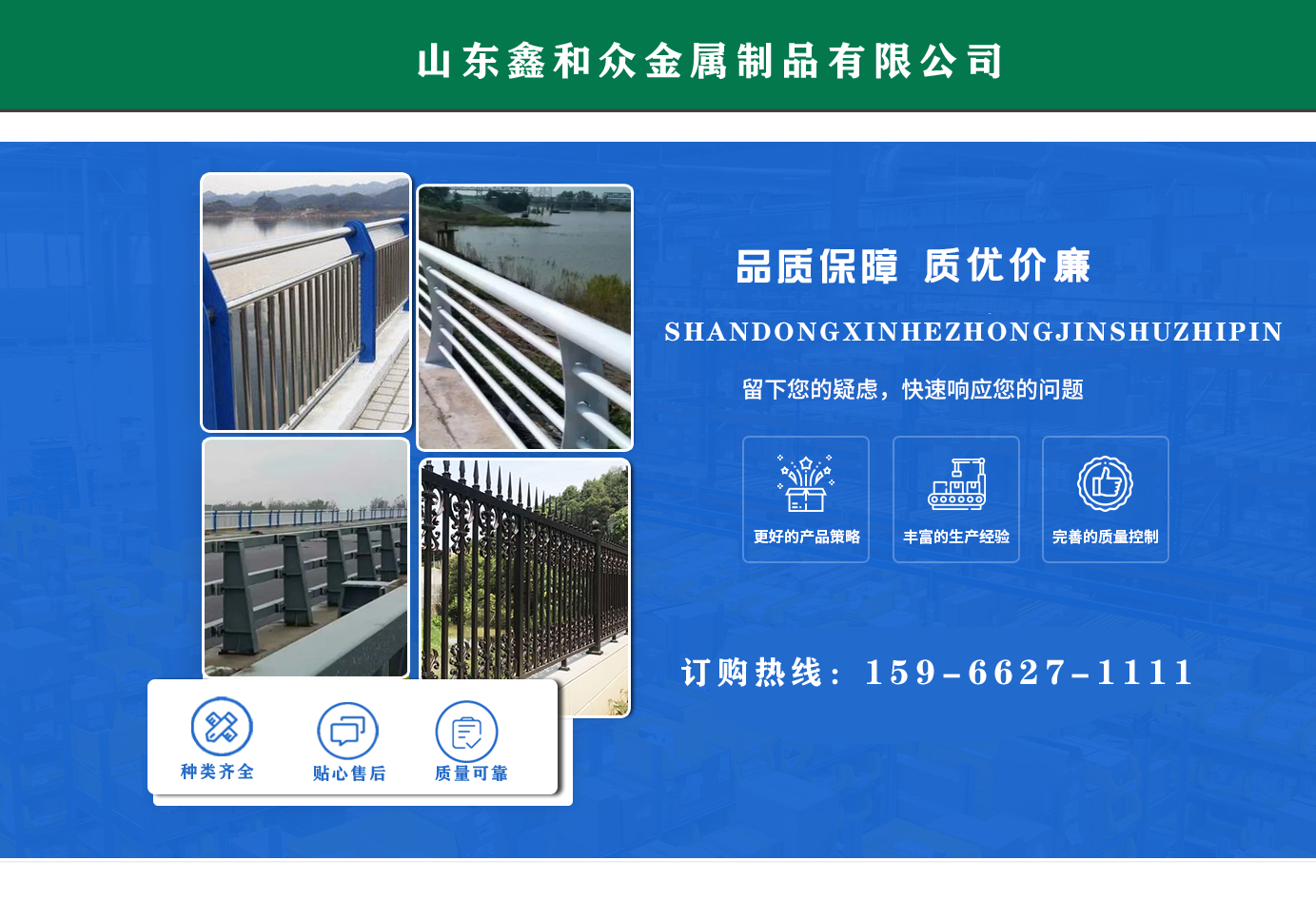 山東鑫和眾金屬制品有限公司主要產(chǎn)品有防撞護(hù)欄,橋梁護(hù)欄,道路護(hù)欄,河道護(hù)欄,不銹鋼護(hù)欄等護(hù)欄。提供設(shè)計(jì)方案,一站式定制,包您滿意價(jià)格優(yōu)惠,歡迎來(lái)電咨詢!    公司常年從事銷(xiāo)售護(hù)欄防撞護(hù)欄,橋梁護(hù)欄,道路護(hù)欄,河道護(hù)欄,不銹鋼護(hù)欄,橋梁鋼護(hù)欄,河道燈光護(hù)欄等。產(chǎn)品廣泛應(yīng)用于橋梁、河道、旅游景區(qū)、道路、公路、公園、小區(qū)、景觀、道路防撞等領(lǐng)域。    公司產(chǎn)品均采用優(yōu)質(zhì)不銹鋼材料,符合相關(guān)標(biāo)準(zhǔn)。各種型號(hào)不銹鋼復(fù)合管及護(hù)欄,質(zhì)量嚴(yán)格把控。產(chǎn)品強(qiáng)度高、耐腐蝕、焊接牢固、抗沖擊、性能好,防撞護(hù)欄結(jié)構(gòu)簡(jiǎn)單、美觀實(shí)用大方。     歡迎前來(lái)訂購(gòu)!...